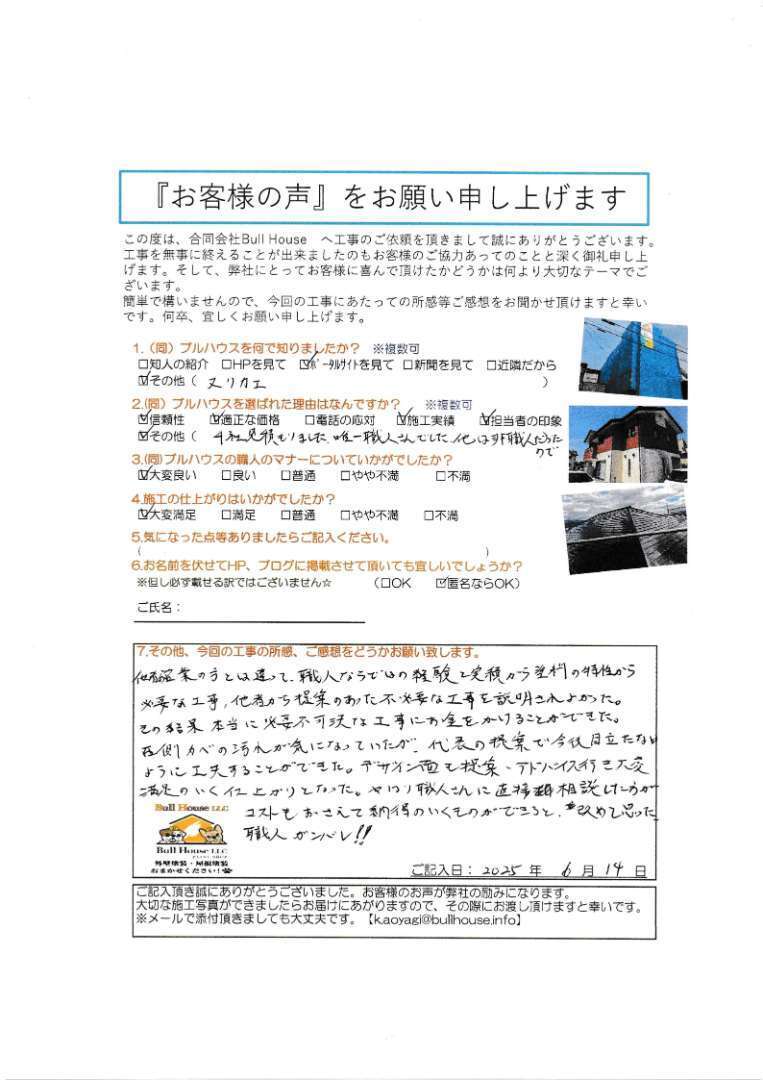 この度は、外壁および屋根の塗装工事をご依頼いただき、誠にありがとうございました。