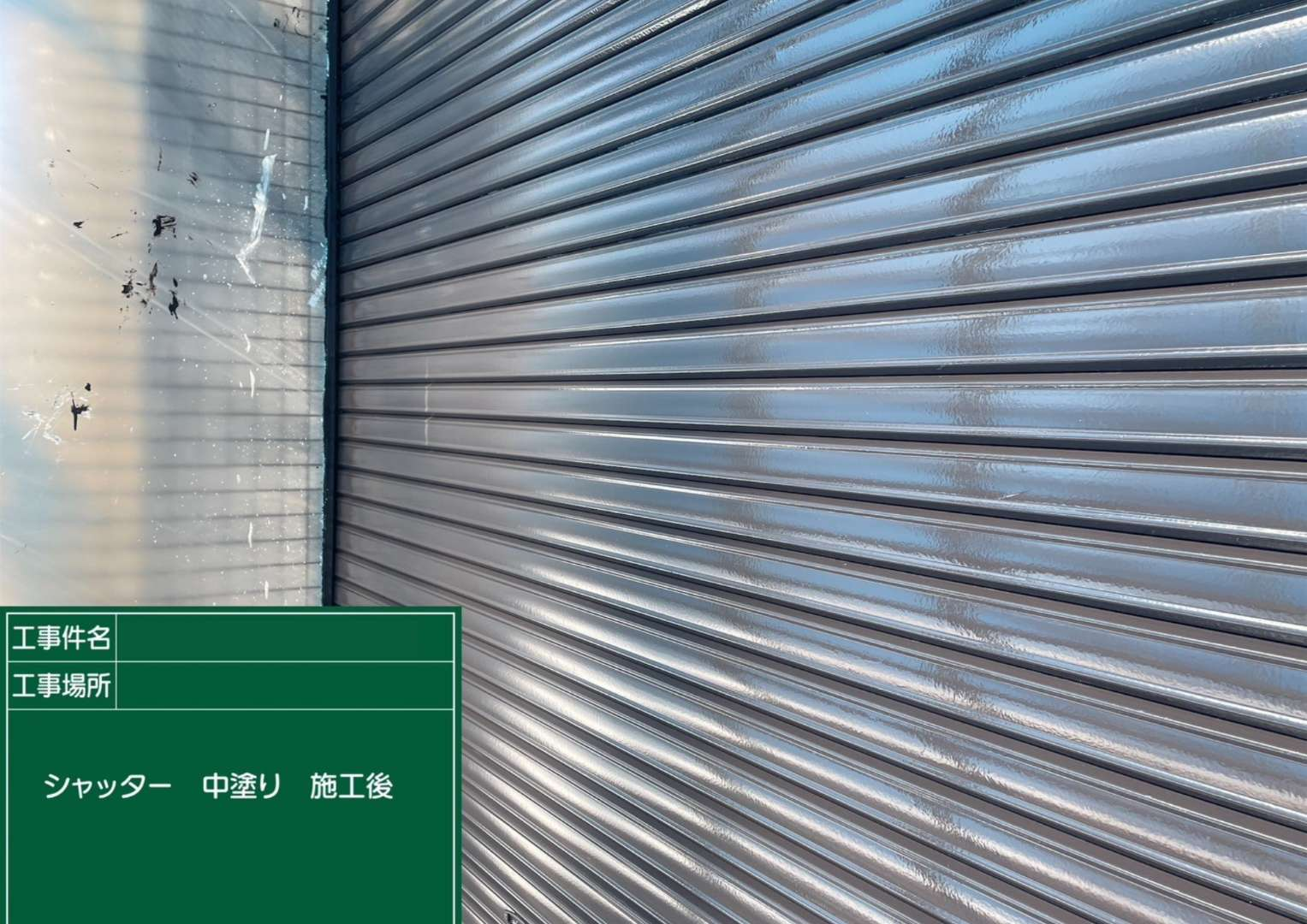 今回の施工では、まず徹底したケレン作業(下地調整)でシャッターに付着した汚れや旧塗膜を落とし、塗料の密着性を高めました。その後、サビ止め効果のある下塗りを施し、中塗り・上塗りと丁寧に3度塗り重ねることで、新築時のような美しいツヤと高い耐久性を実現しました。サビに強いシャッターのシリコン塗装の完了です。