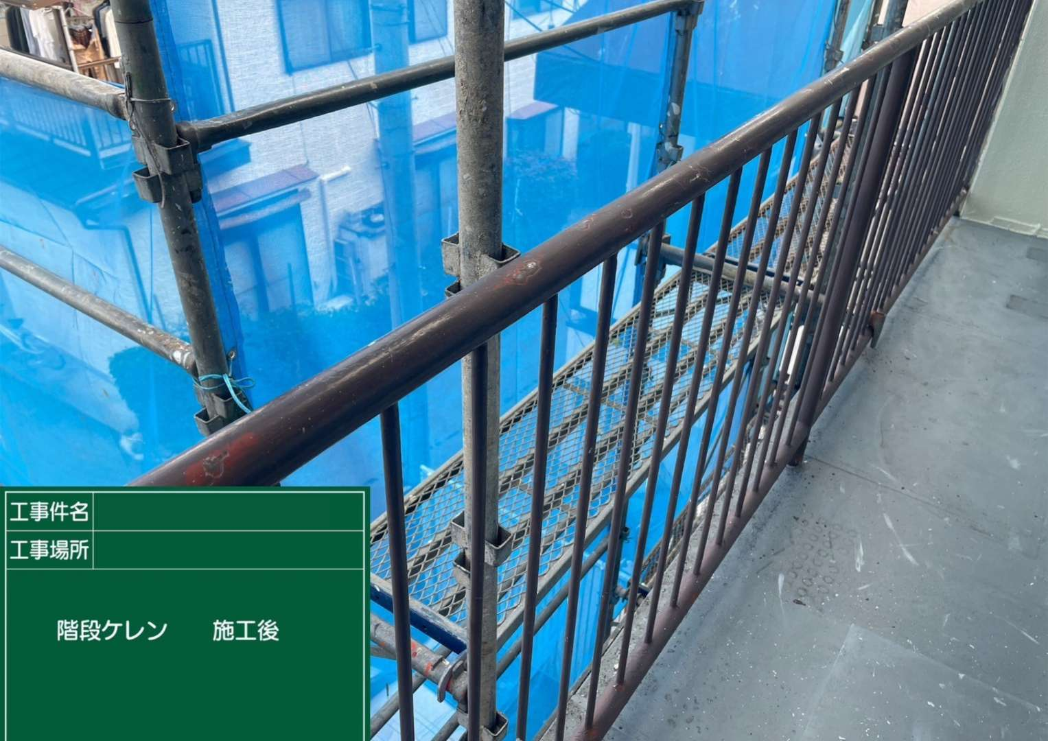 今回の施工では、まずケレン作業で徹底的に鉄骨階段のサビを落とし、塗料の密着性を高める下地調整を行いました。その後、高性能なサビ止め塗料で下塗りを行い、中塗り・上塗りと丁寧に塗り重ねることで、耐久性と美観を両立させています。