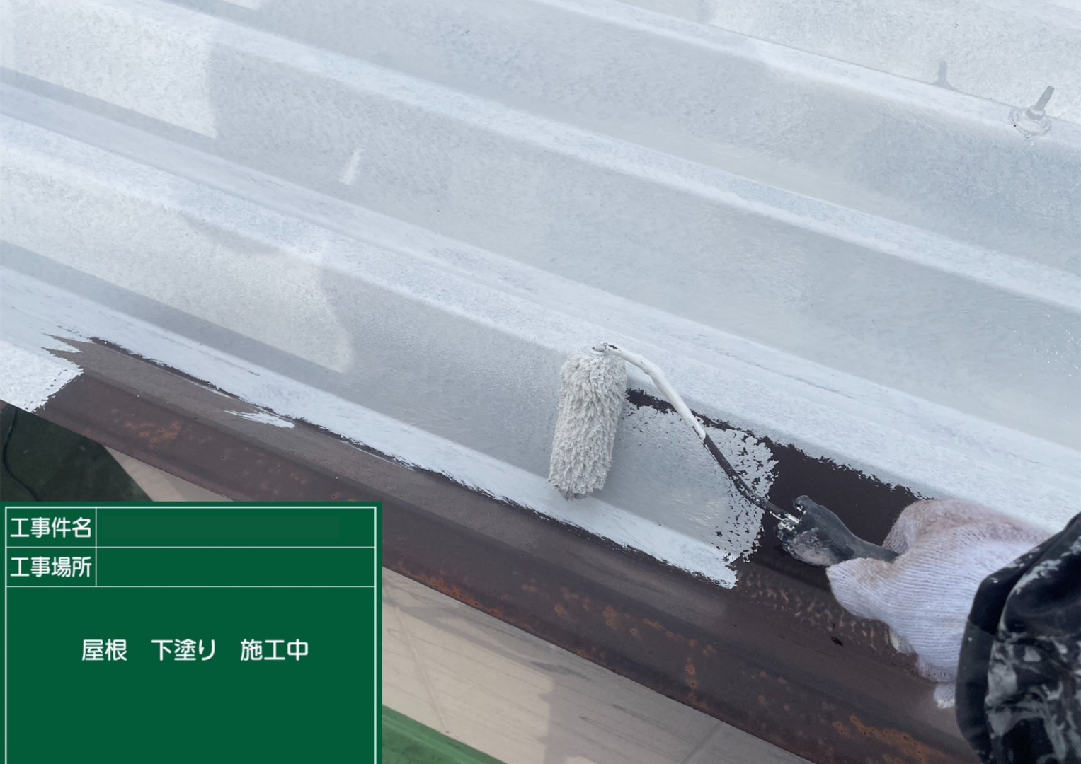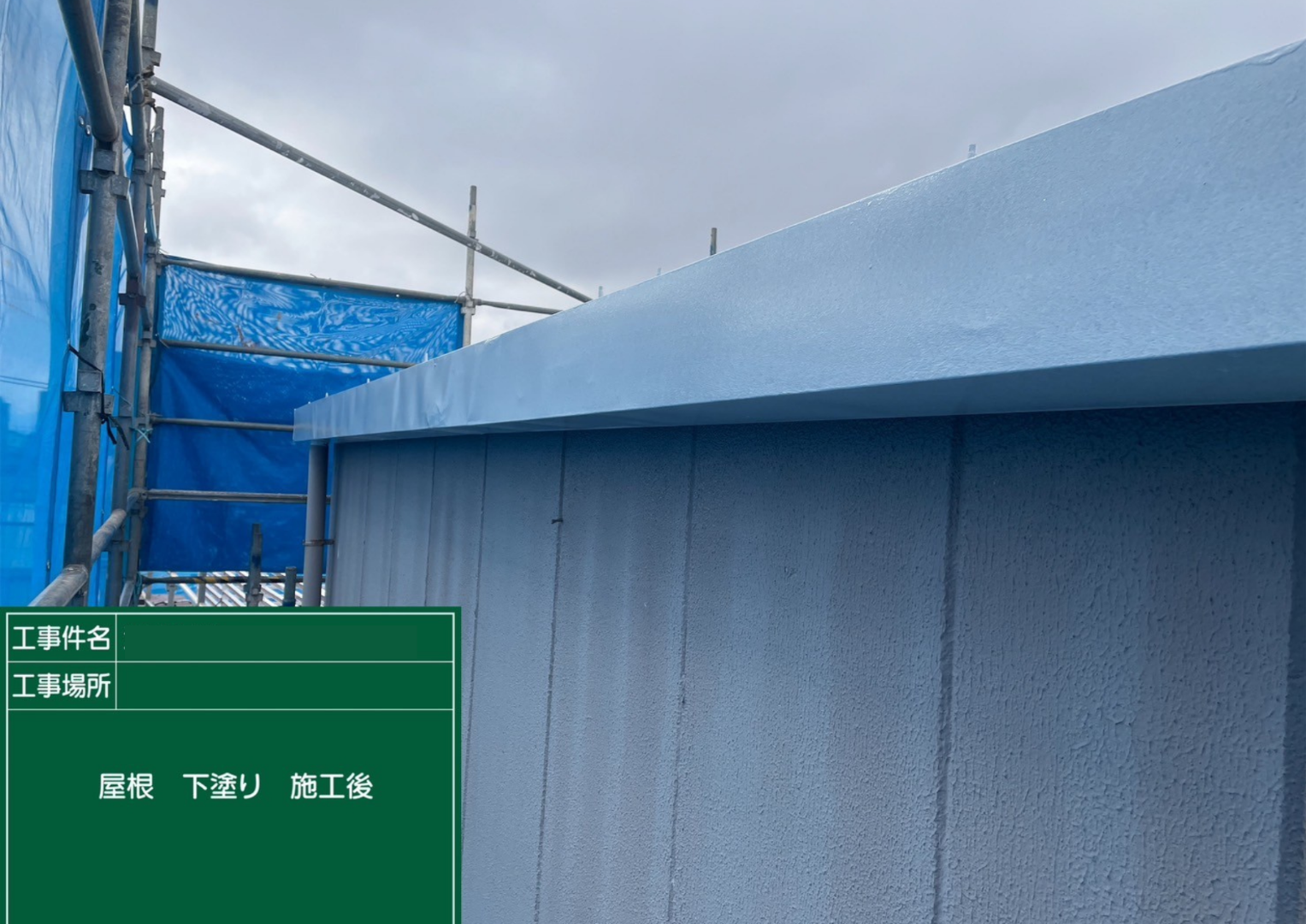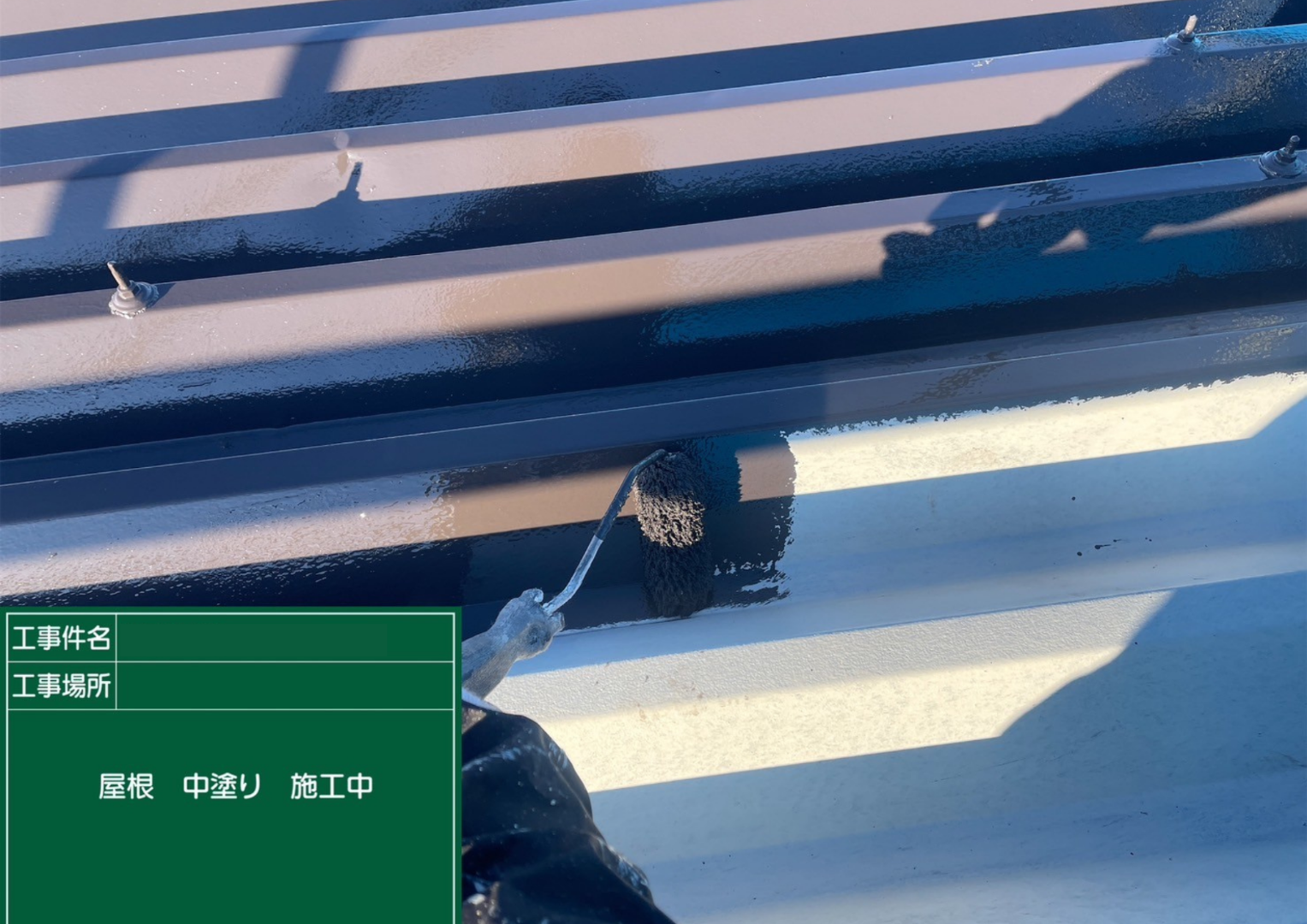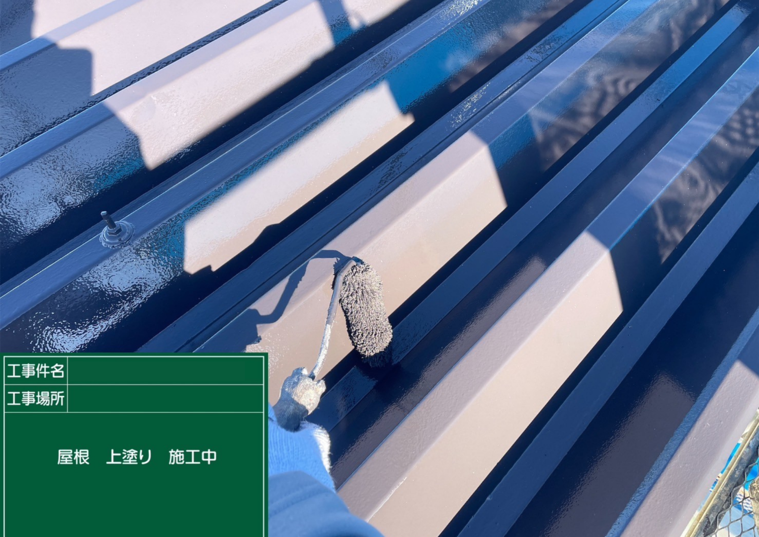 作業工程では、まず高圧洗浄で屋根に付着した汚れを落とした後、錆の発生を抑え密着性を高める下塗り材(プライマー)を丁寧に塗布。その後、遮熱性・耐久性に優れた中塗り、そして美観と保護機能を最大化させる上塗り(トップコート)と、ローラーを用いて丁寧に3層重ねて仕上げました。