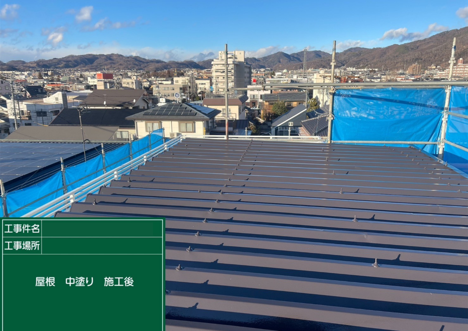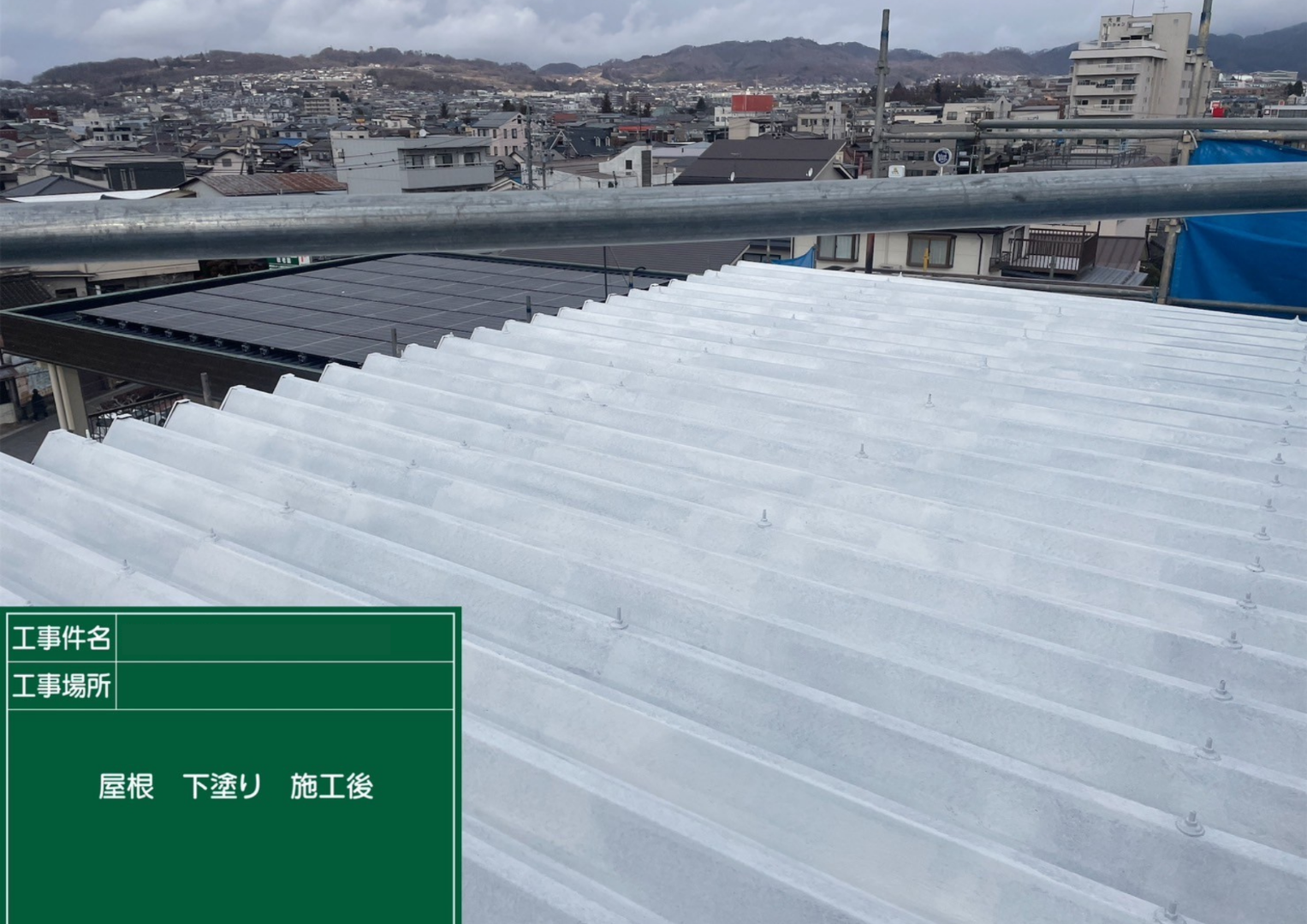 長野県松本市のビルにて、屋上の折板屋根塗装工事を実施いたしました。施工前の点検では、屋根の経年劣化による塗膜の剥がれや錆(サビ)が見られ、放置すれば屋根材の腐食や雨漏りのリスクがある状態でした。