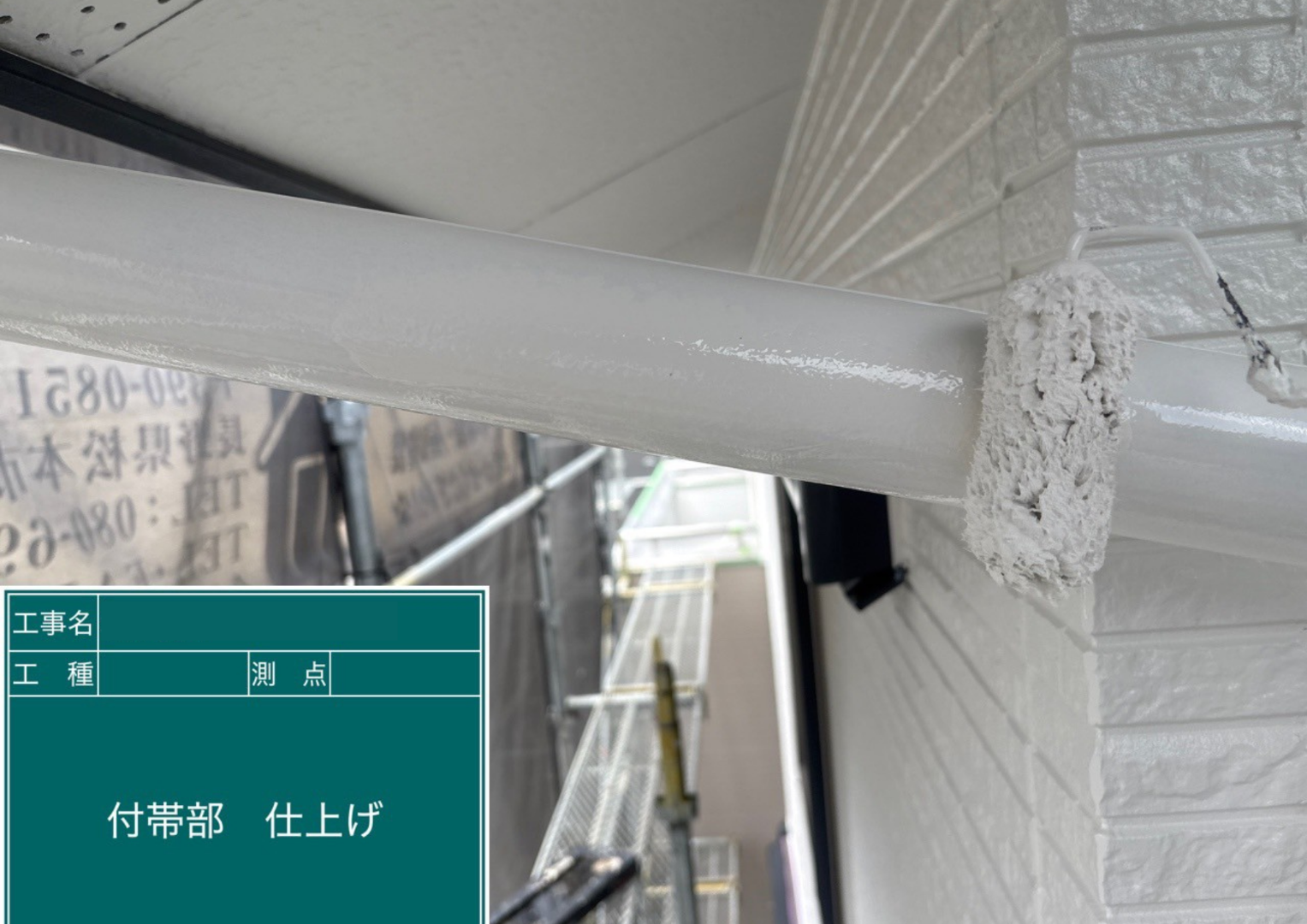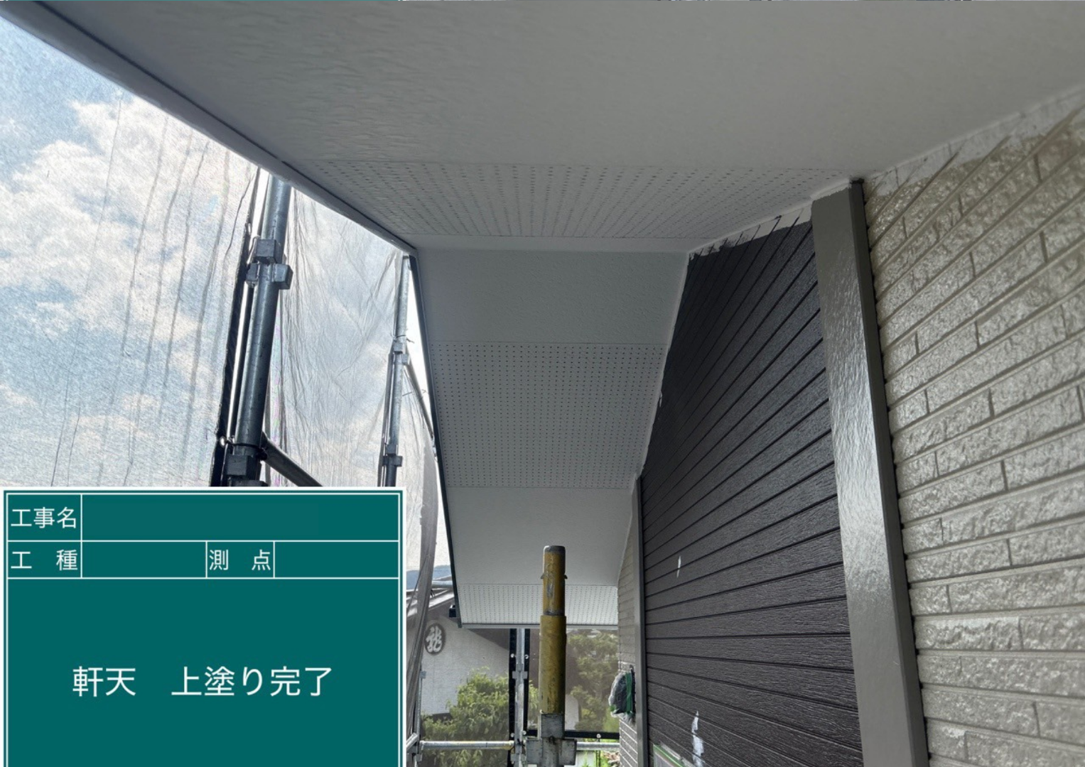 屋根の裏側にあたる「軒天」の上塗りが完了しました。湿気がこもりやすい場所なので、通気性と防カビ性に優れた塗料を使用しています。明るいホワイトで仕上げることで、建物全体がパッと明るい印象になり、外壁の色とのコントラストも美しく映えます。