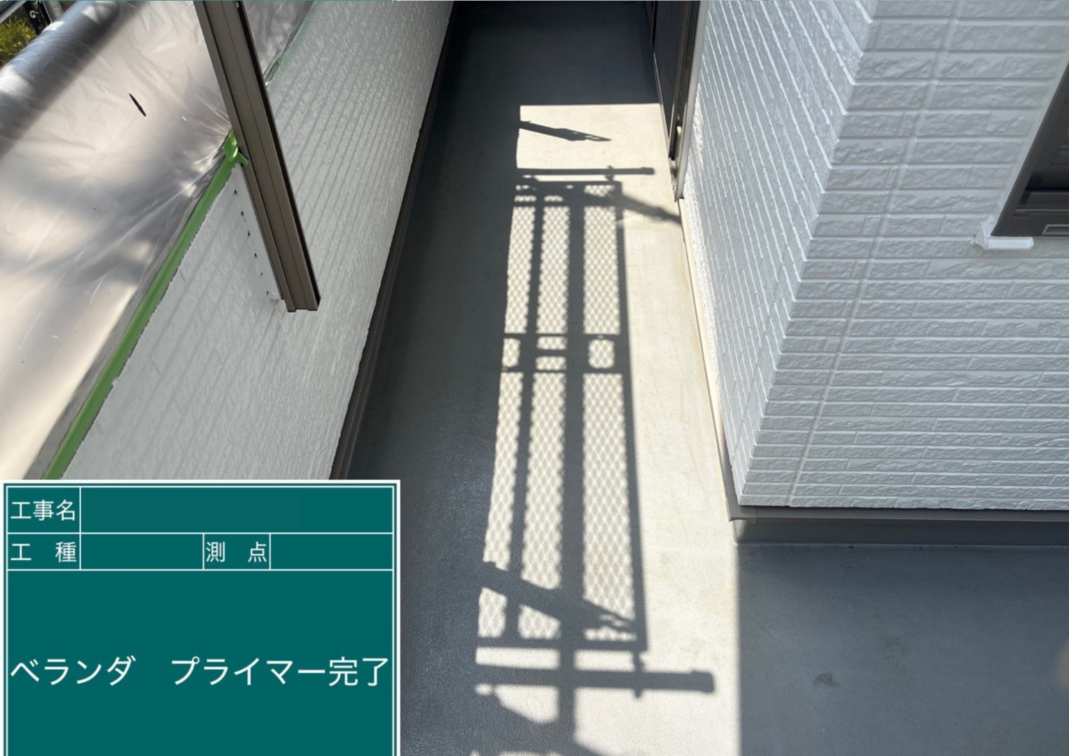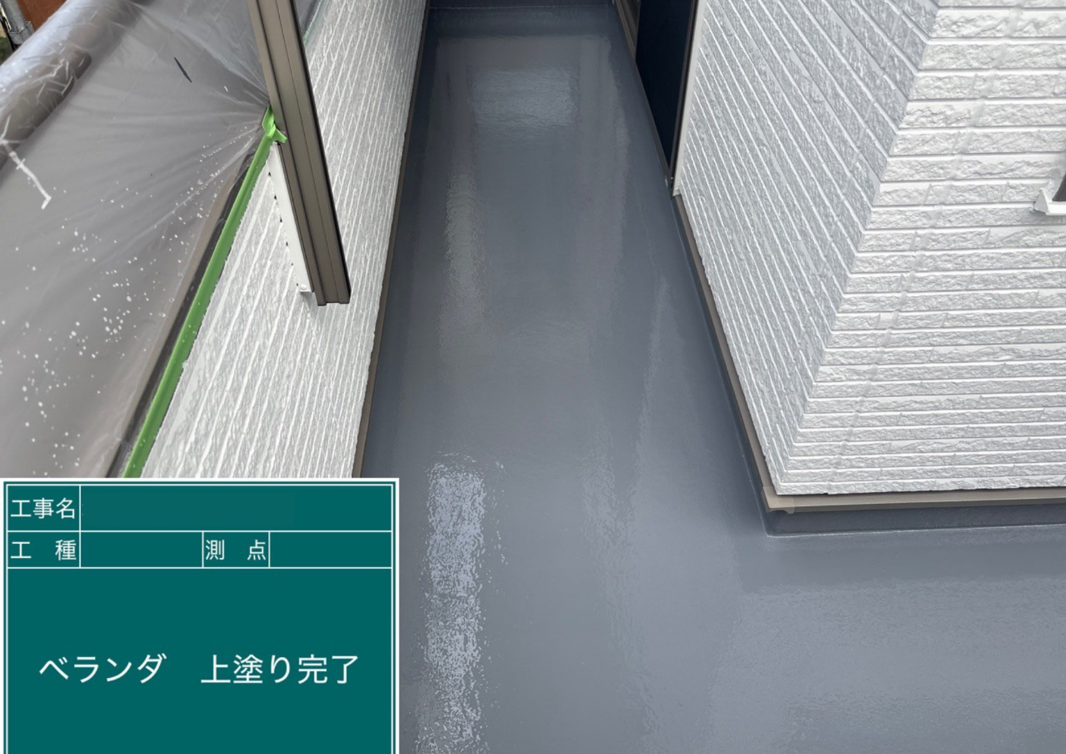 ベランダの防水塗装、最終仕上げ(トップコート)が完了しました。継ぎ目のない美しい防水層が形成され、雨漏りのリスクを防ぎます。表面も滑らかになり、お手入れもしやすくなりました。